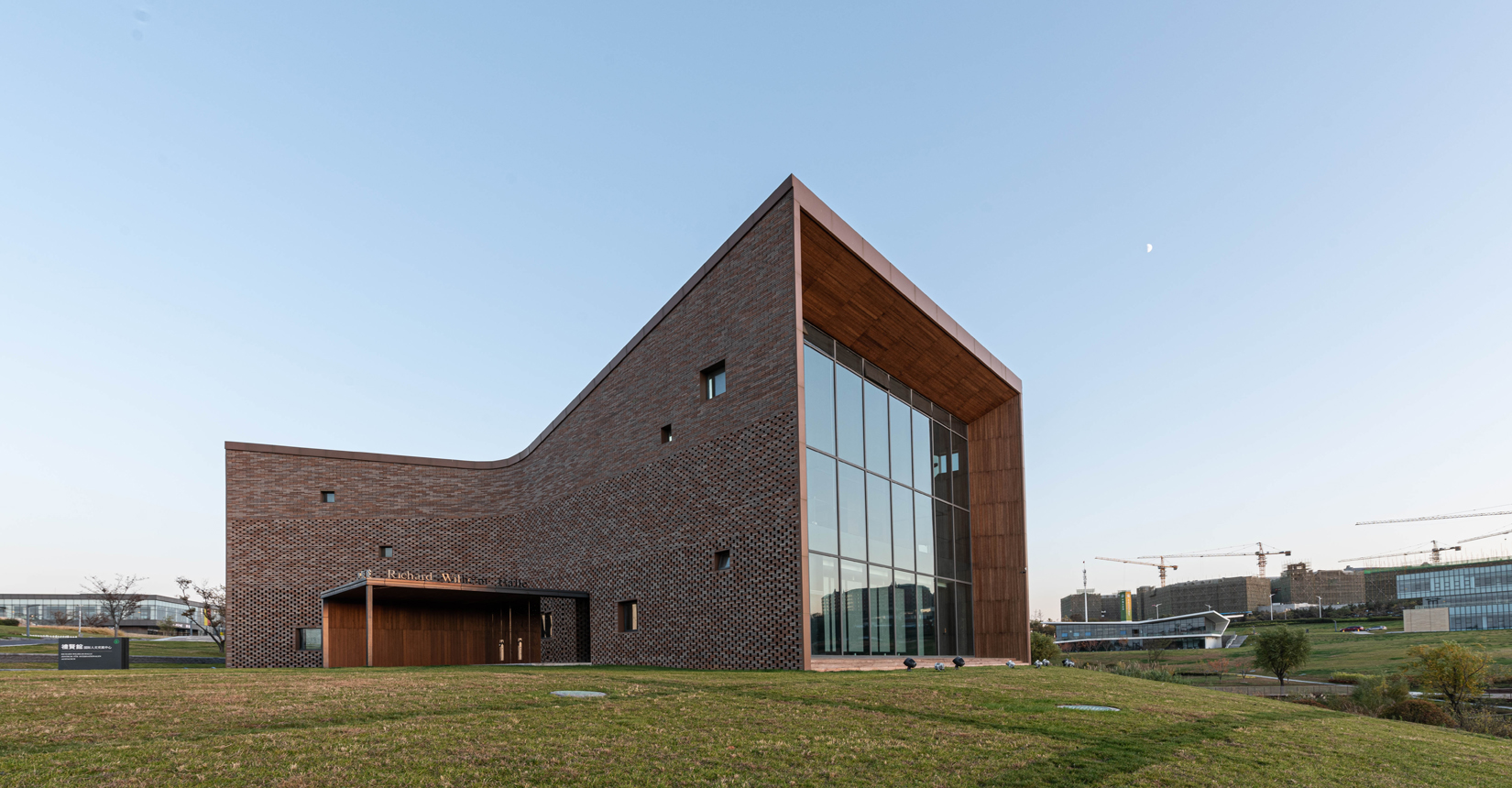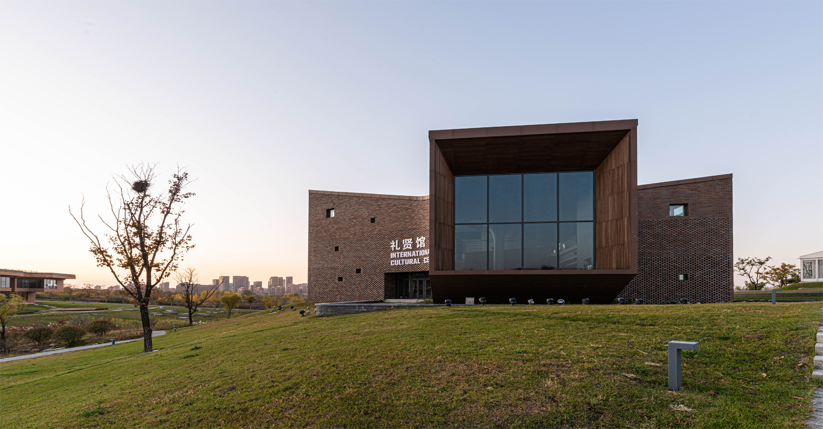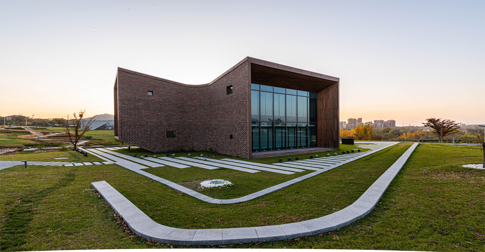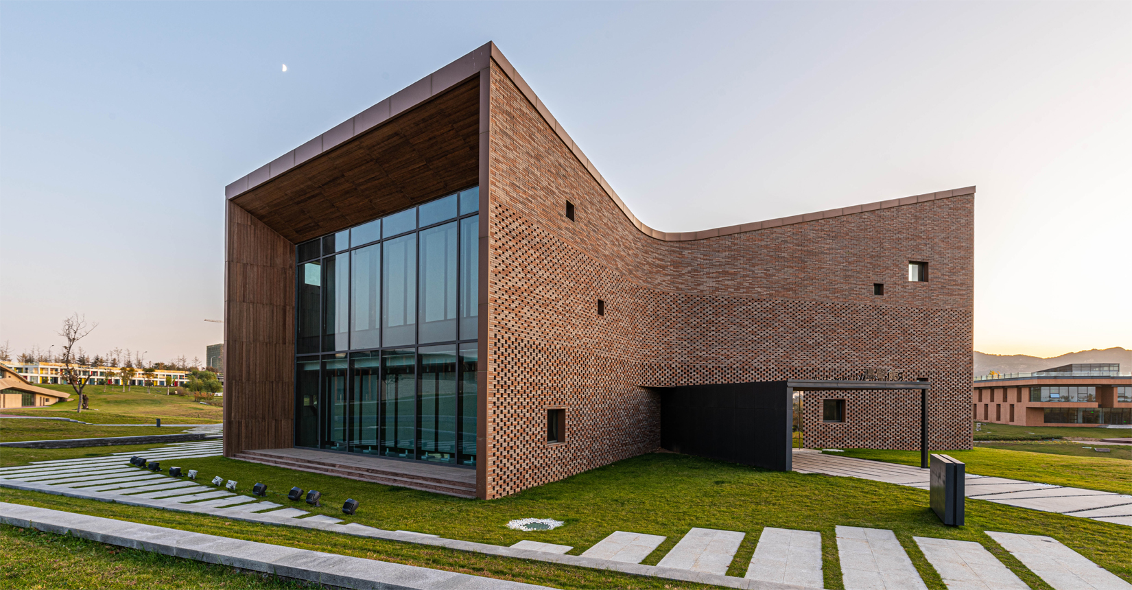 建筑南側設置次要出入口,并與水流形成互動。建筑立面材質采用精致的磚材拼面,屋頂采用微微揚起的處理手法;穩(wěn)重且不失變化。