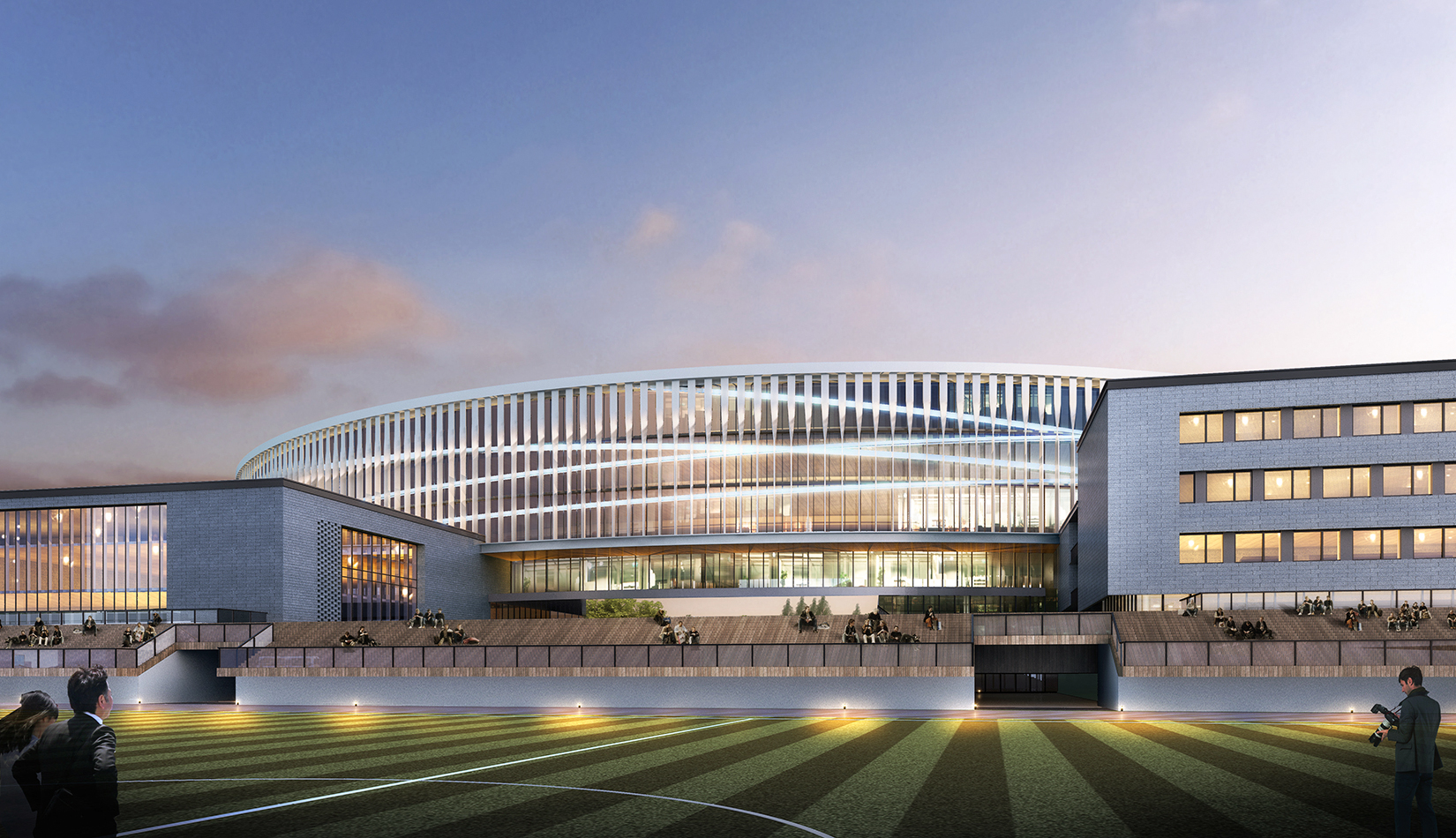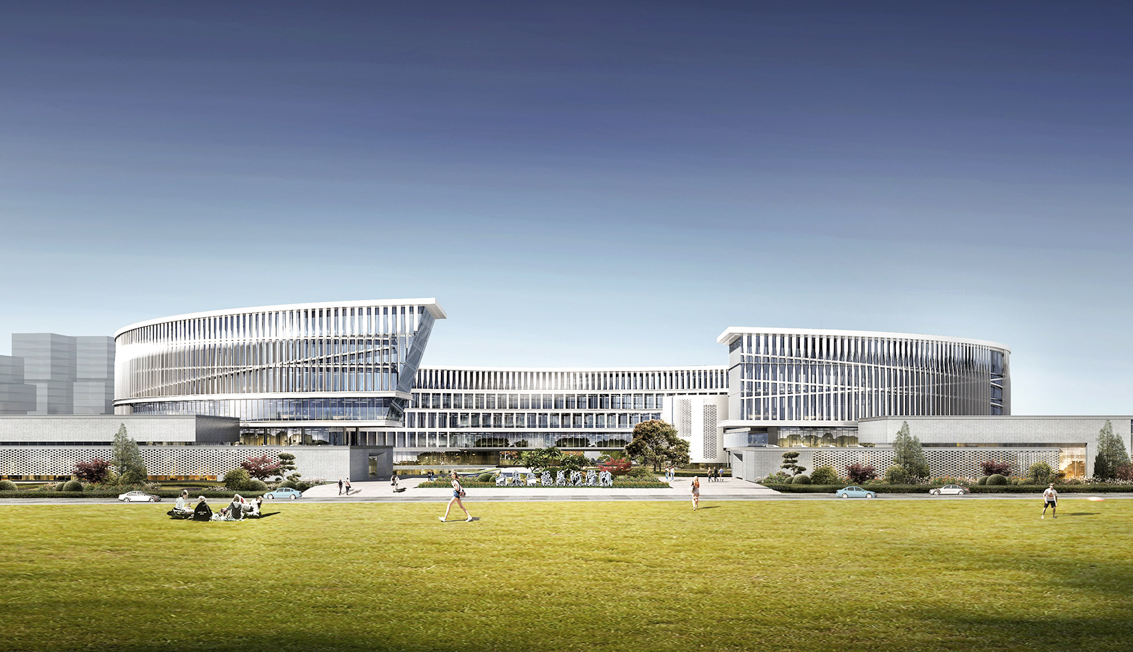 建筑方形體量運(yùn)用魯班鎖的本質(zhì)——榫卯結(jié)構(gòu),進(jìn)行體塊塑造,將這種天人合一的工匠精神貫穿整個(gè)校園。立面材質(zhì)上,采用石材及具有中國古典韻味的磚幕墻,體現(xiàn)學(xué)校厚重的文化底蘊(yùn)?!棒敯嗑€”交織在教學(xué)綜合體所在的圓形體塊上,利用動(dòng)感流線型的線條,使建筑更具有藝術(shù)氣息。