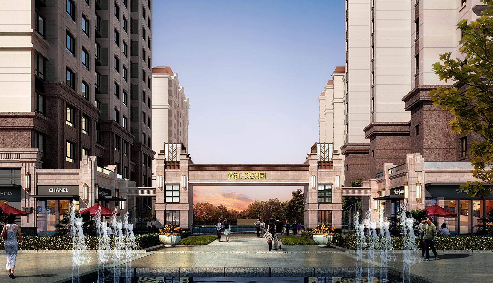 設(shè)計緊扣建筑規(guī)劃理念,營造歐式風(fēng)情、自然舒適住區(qū)。重點打造中心區(qū)域的自然景觀區(qū),玫瑰湖、陽光溪、森林海是景觀設(shè)計的亮點,將水系引入宅間花園中,曲水流觴,層層環(huán)繞,與植物形成呼應(yīng)。適當利用微地形,形成錯落有致的景觀空間,保證各組團的綠蔭效果,植物組團種植,保證入戶空間的合理性、美觀性,給住戶以溫馨的回家感受。