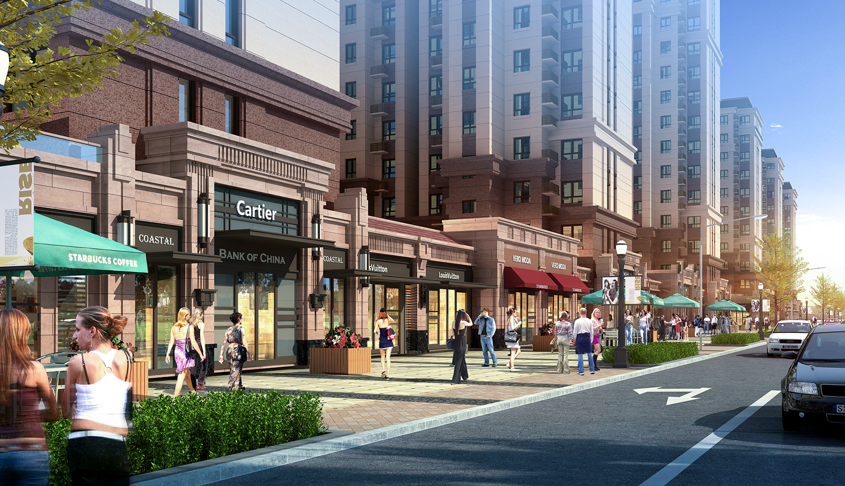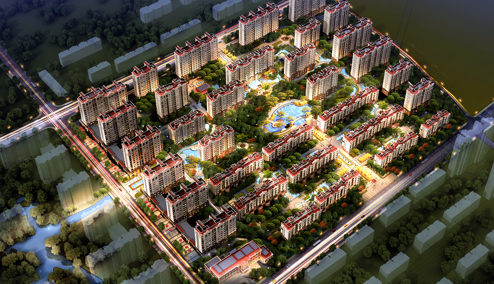 該項目設(shè)計以聚核、溝通、布局、點睛為規(guī)劃理念,打造一個高品質(zhì)水景花園社區(qū)。