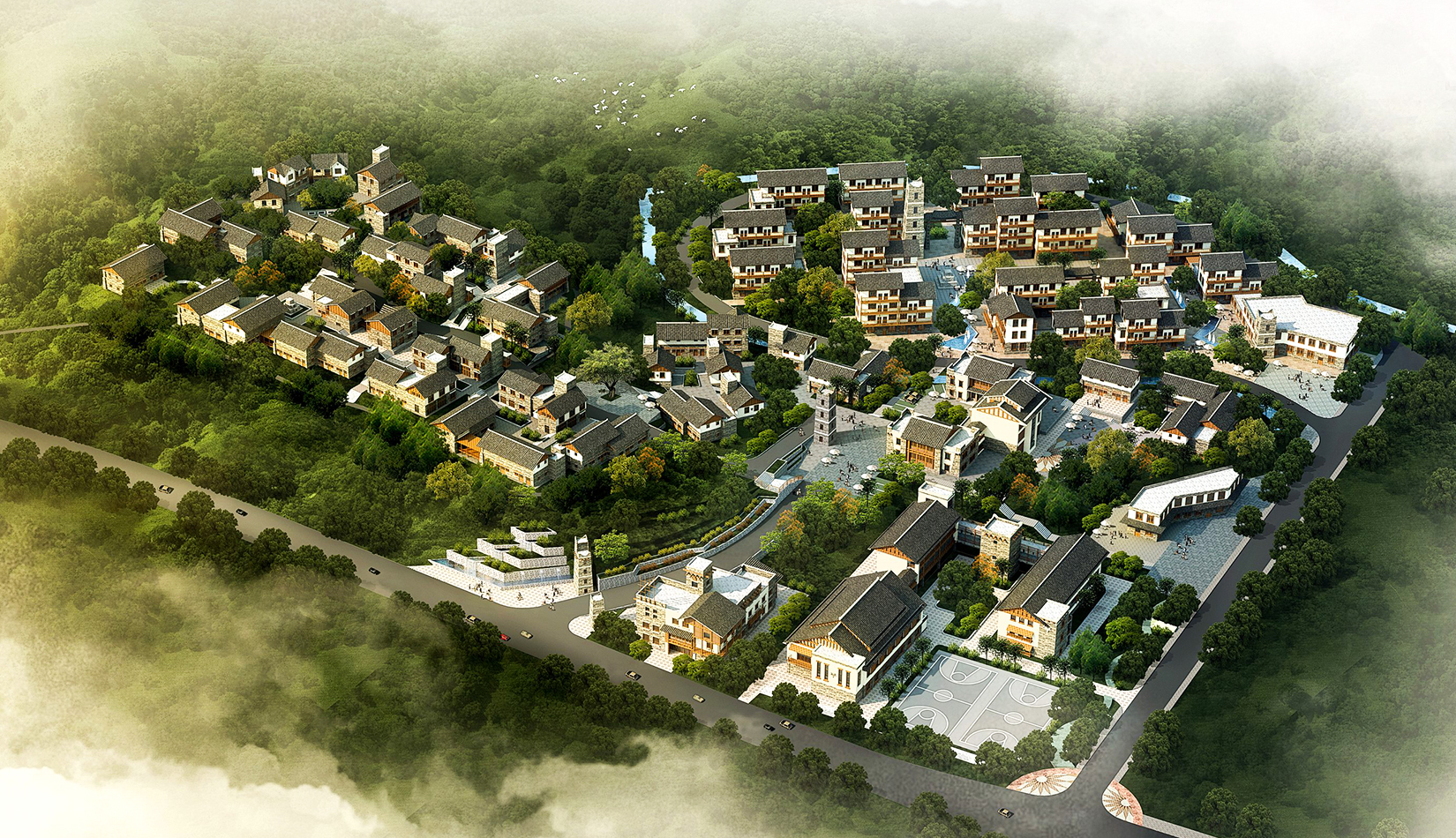 建筑布局依山就勢(shì),充分結(jié)合自然地形地貌,建筑體量與周邊環(huán)境和諧相融的生態(tài)型城鎮(zhèn);
