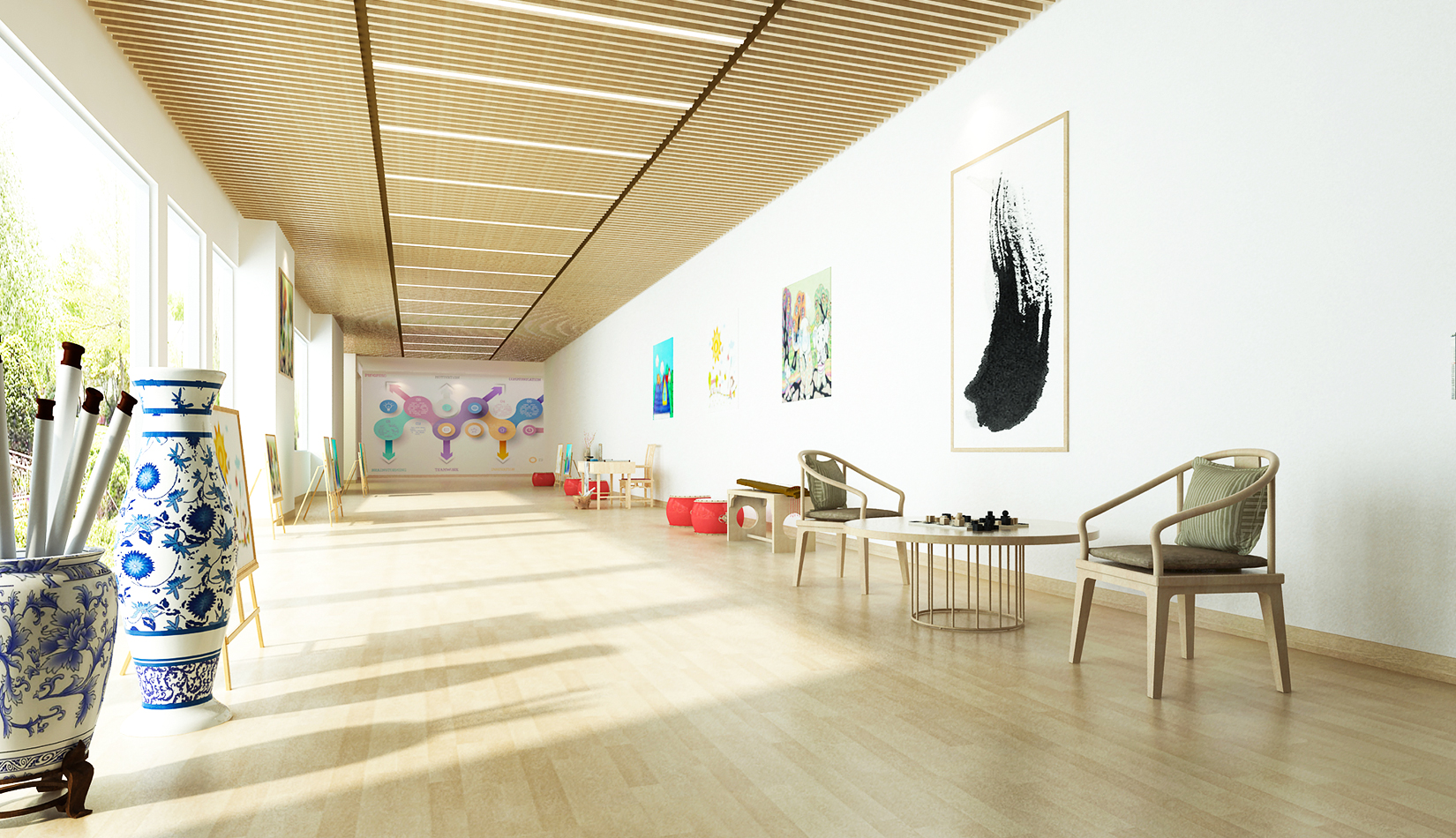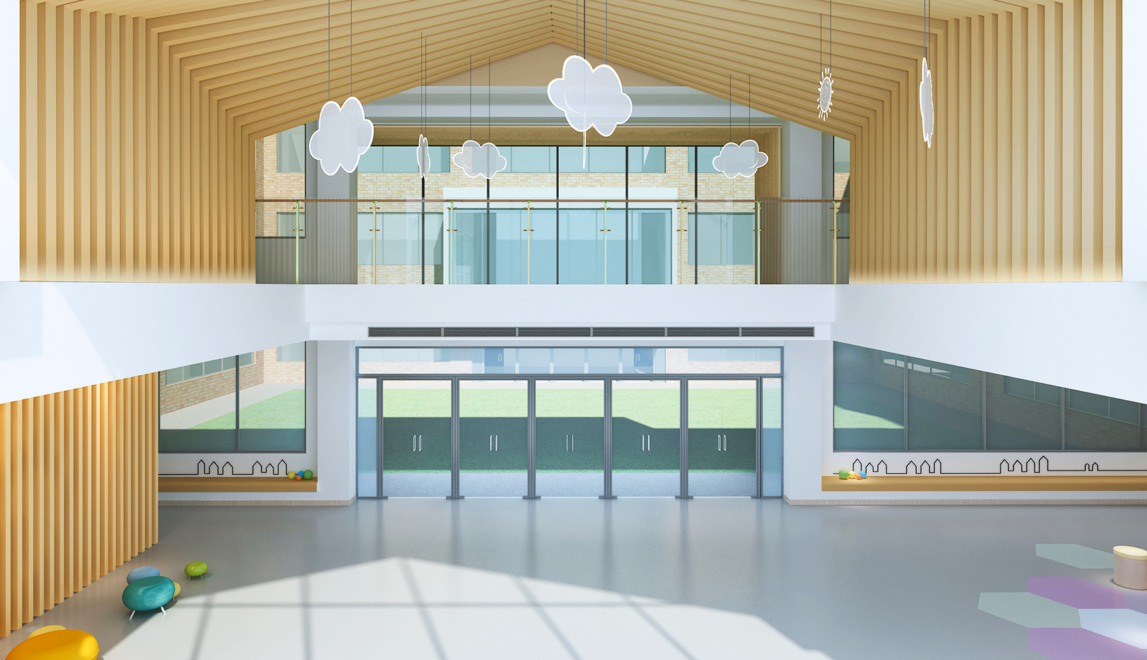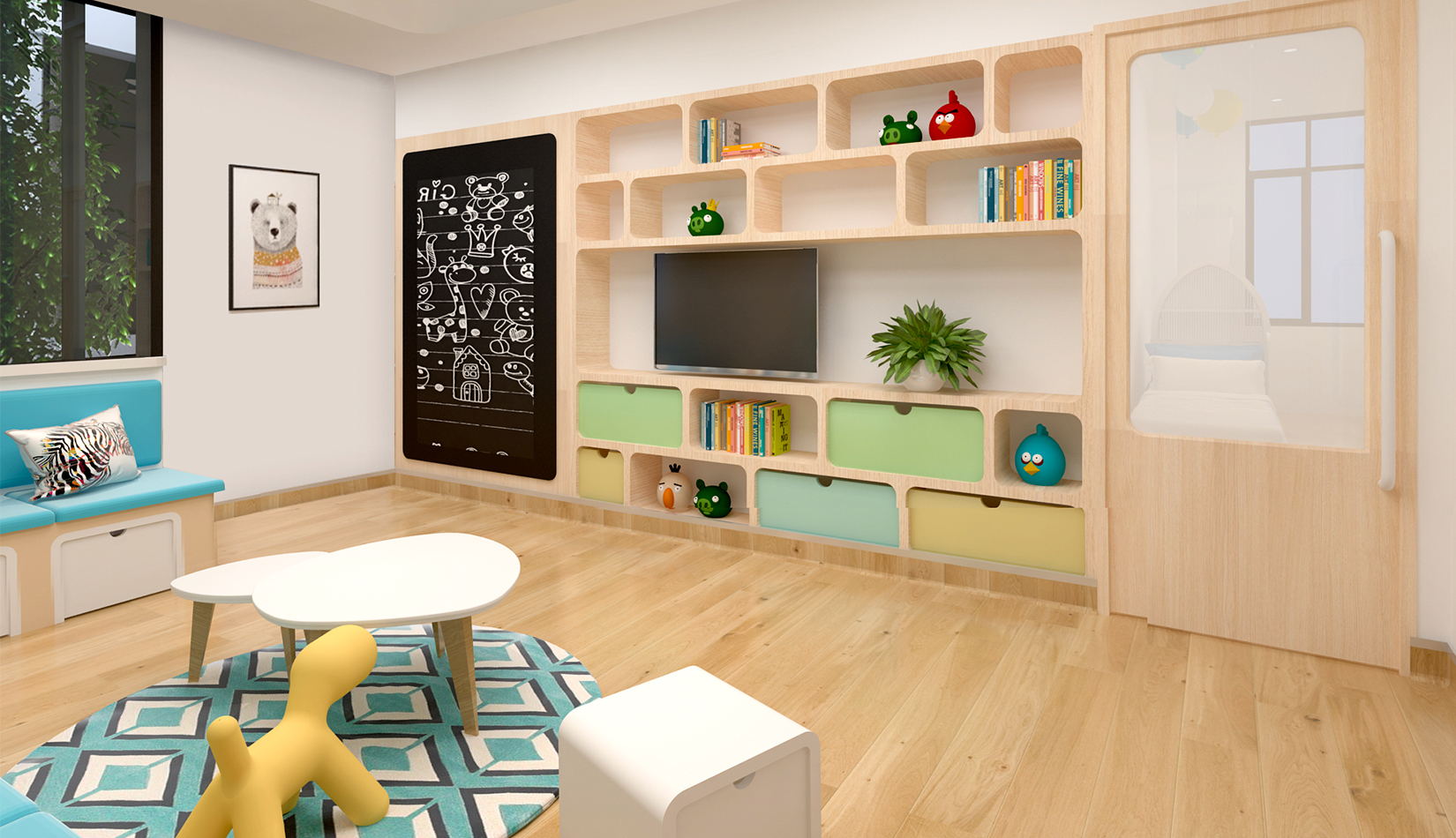 室內(nèi)延續(xù)建筑,空間內(nèi)部采光非常好。設(shè)計(jì)簡(jiǎn)潔、現(xiàn)代,以白色為主色調(diào),搭配淺木色作為室內(nèi)顏色?;顫姟⒑脛?dòng)、天真、可愛是兒童最大的特點(diǎn),在其具體功能空間設(shè)計(jì)中,我們把這些特點(diǎn)和空間色彩結(jié)合起來(lái),不同的空間根據(jù)其使用功能,采用了不同的色彩搭配。