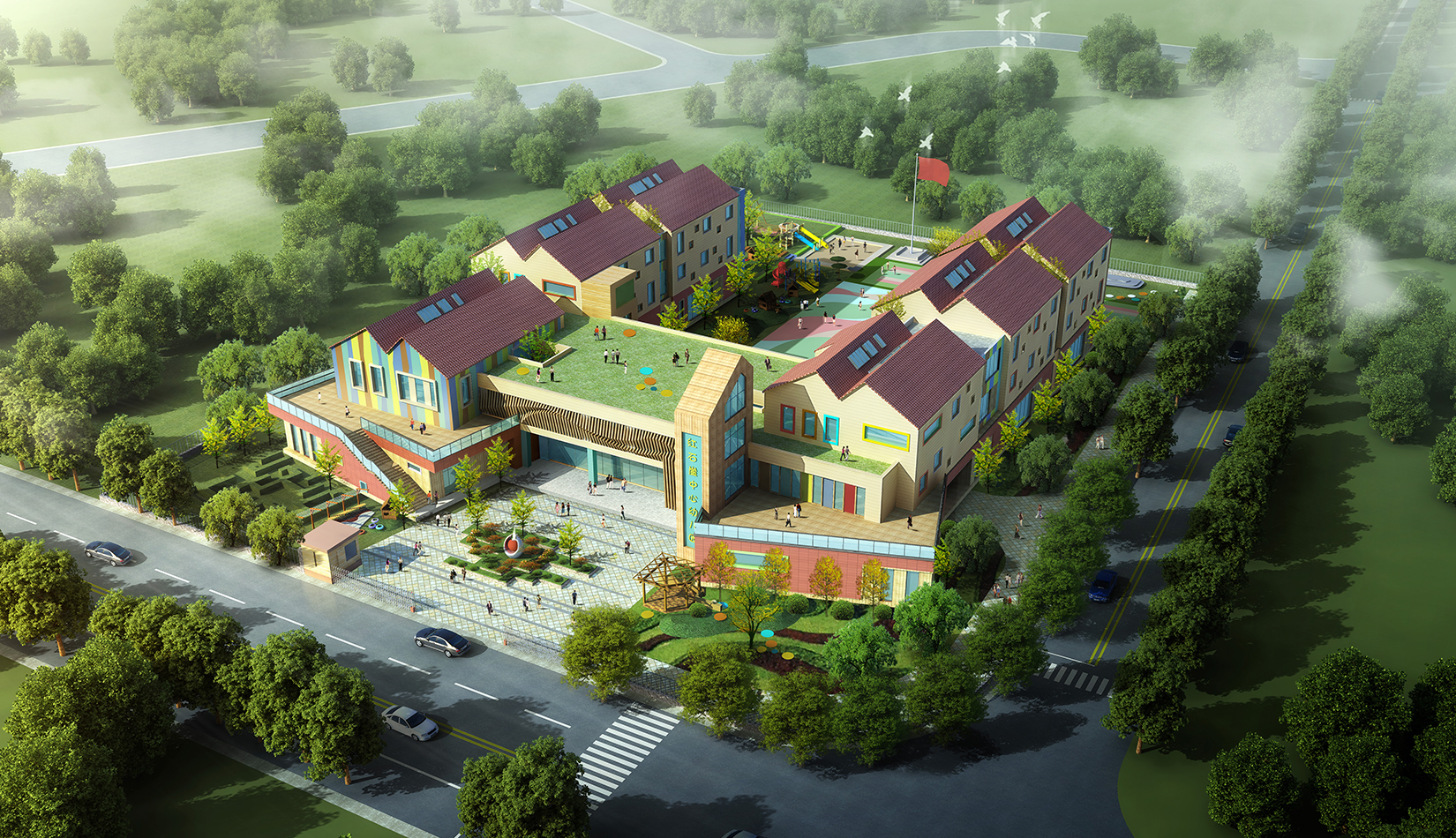 建筑造型來源于兒童最初對房子的印象并進行延伸,加上積木搭接形態(tài),形成C字形圍合的主體建筑,就像父母溫暖的懷抱;建筑造型跟兒童產(chǎn)生很好的親切感,讓兒童將上幼兒園成為快樂的事情。同時形態(tài)結合地緣文化特色,采用雙折坡屋頂,寓意展翅翱翔的海鷗。